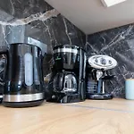 Det finns te-/kaffebryggare samt ett utrustat pentry. I köket finns även ugn, köksredskap och glas.